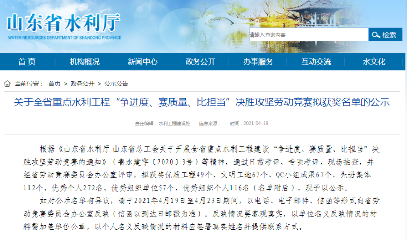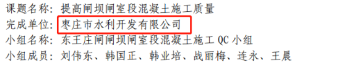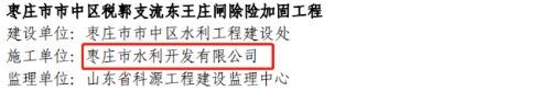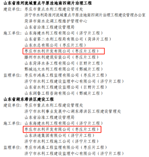 2021年4月19日,山东省水利厅网站公示了全省重点水利工程“争进度、赛质量、比担当”决胜攻坚劳动竞赛拟获奖名单。枣庄市水利开发有限公司荣获先进集体奖项(峄城区阴平沙河前张闸除险加固工程项目经理部)、文明工地奖项3个(枣庄市市中区税郭支流东王庄闸除险加固工程、山东省淮河流域重点平原洼地南四湖片治理工程、山东省湖东滞洪区建设工程)、QC小组成果奖项(东王庄闸闸坝闸室段混凝土施工QC小组)、优秀个人奖项(高级工程师连永)。