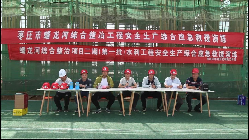 为进一步检验蟠龙河综合整治项目中应急预案的可行性和可操作性,同时起到锻炼队伍、磨合机制及安全教育的目的。6月5日在山家林橡胶坝管理房处,由枣庄坤泽置地开发有限公司组织开展安全生产综合应急演练活动。山东鸿禹工程监理咨询有限公司、青岛瑞源工程集团有限公司、临沂市水利工程处、枣庄市水利开发有限公司项目负责人及安全员共计46人参加本次演练,邀请了枣庄市蟠龙河建设管理服务中心人员进行观摩。