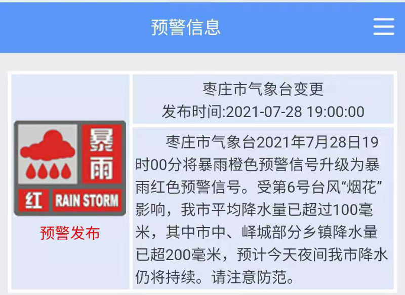 7月28日 19点00分 暴雨橙色预警信号变更为暴雨红色预警信号。