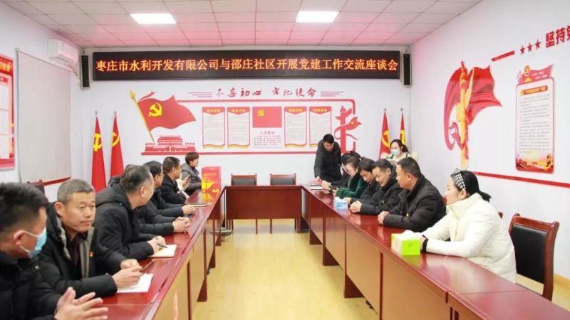为提升党建工作水平,互相分享好的经验做法,形成共同发展的新格局,近日,市中区邵庄社区委员会党支部副书记李涛带领社区党员,莅临枣庄市水利开发有限公司党支部开展“交流学习促党建 双提升 共发展”为主题的党建工作经验交流活动。公司党支部副书记岳磊、宣传委员连永及党员代表参加本次交流座谈。