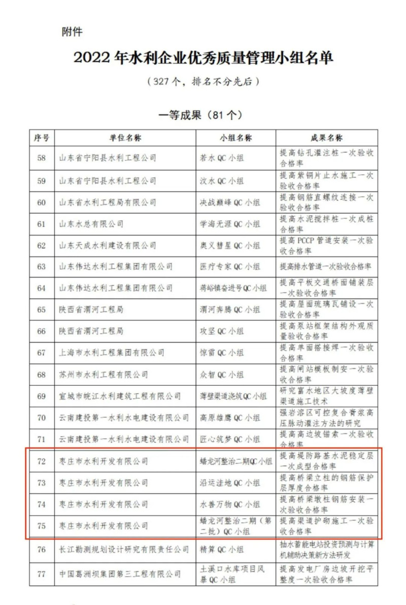 近日,由中国水利企业协会主办的2022年水利企业质量管理小组竞赛活动以视频直播的形式成功举办。枣庄市水利开发有限公司“蟠龙河整治二期QC小组”、“沿运洼地QC小组”、“水善万物QC小组”和“蟠龙河整治二期(第二批)QC小组”在本次竞赛中表现优异,均荣获一等成果奖。