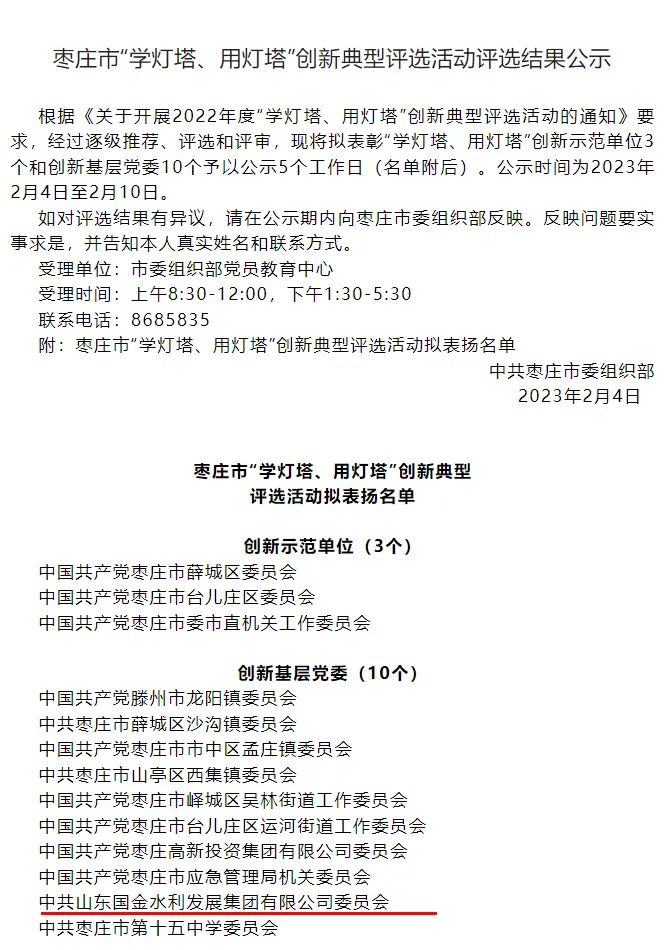 近日,中共枣庄市委组织部发布了《枣庄市‘学灯塔、用灯塔’创新典型评选活动拟表扬名单》,在10个创新基层党委中,集团党委作为唯一一个市属国有企业党委荣列在位。