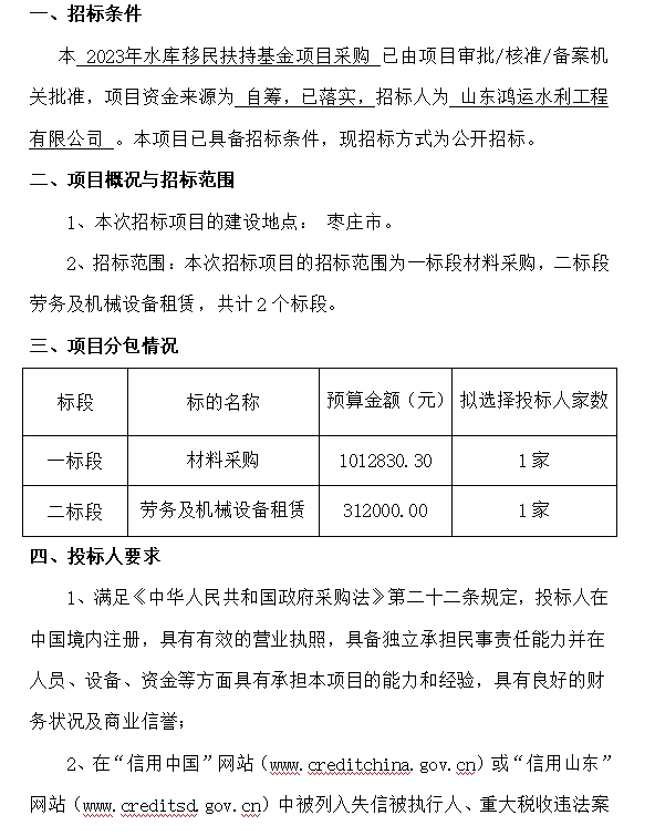 2023年水库移民扶持基金项目采购招标公告