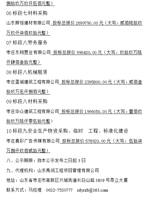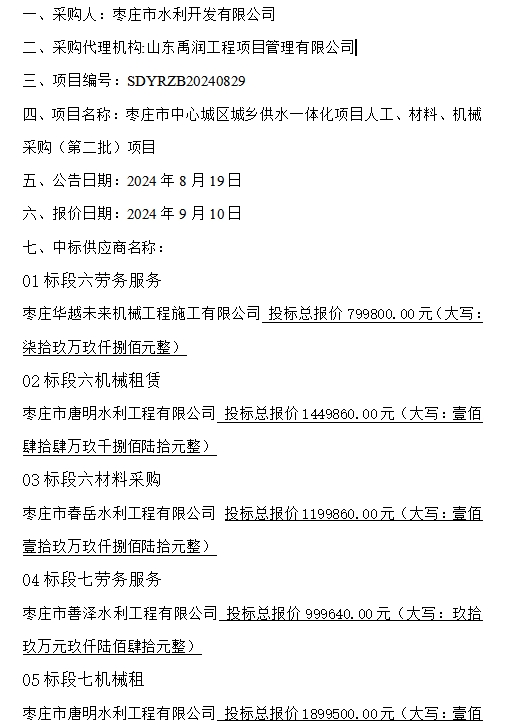 枣庄市中心城区城乡供水一体化项目人工、材料、机械采购(第二批)项目中标公告