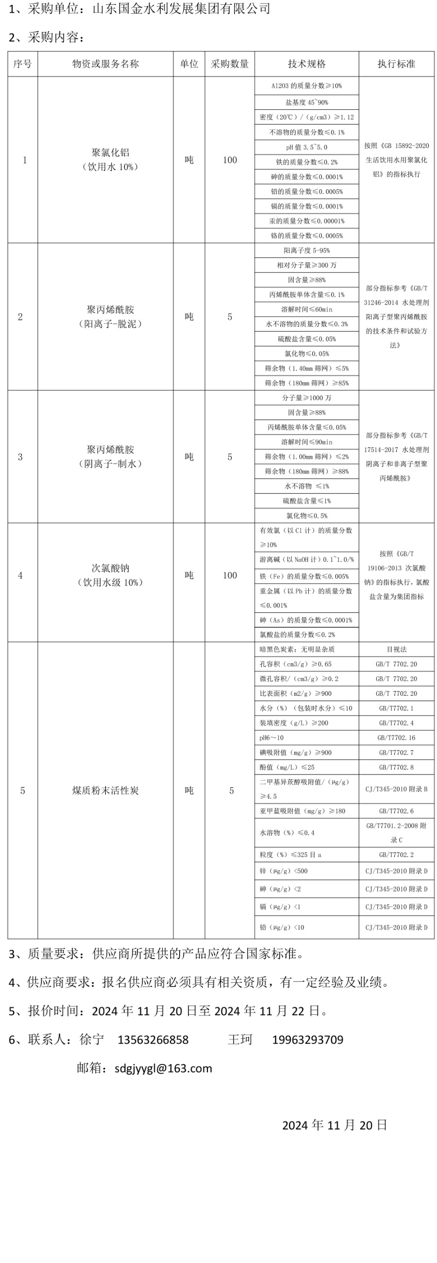 山东国金水利发展集团有限公司中心水厂药剂采购询价公告