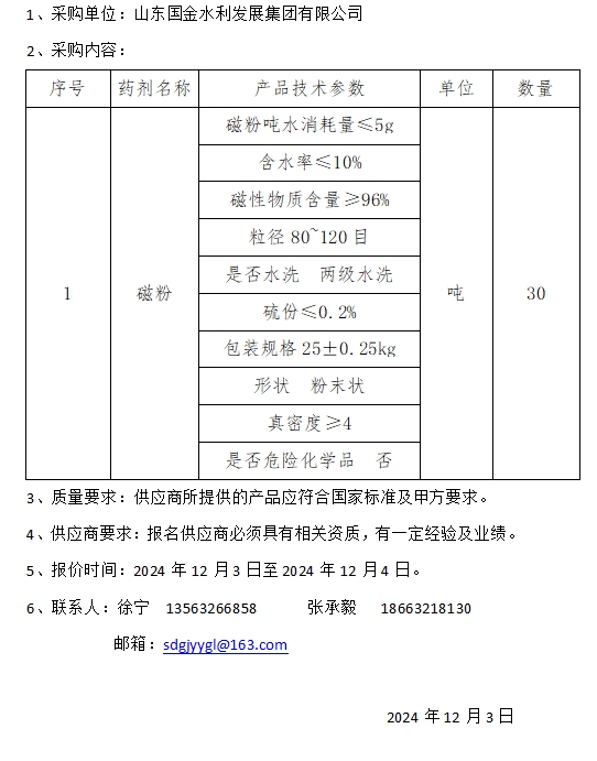 山东国金水利发展集团有限公司国惠污水厂磁粉采购询价公告