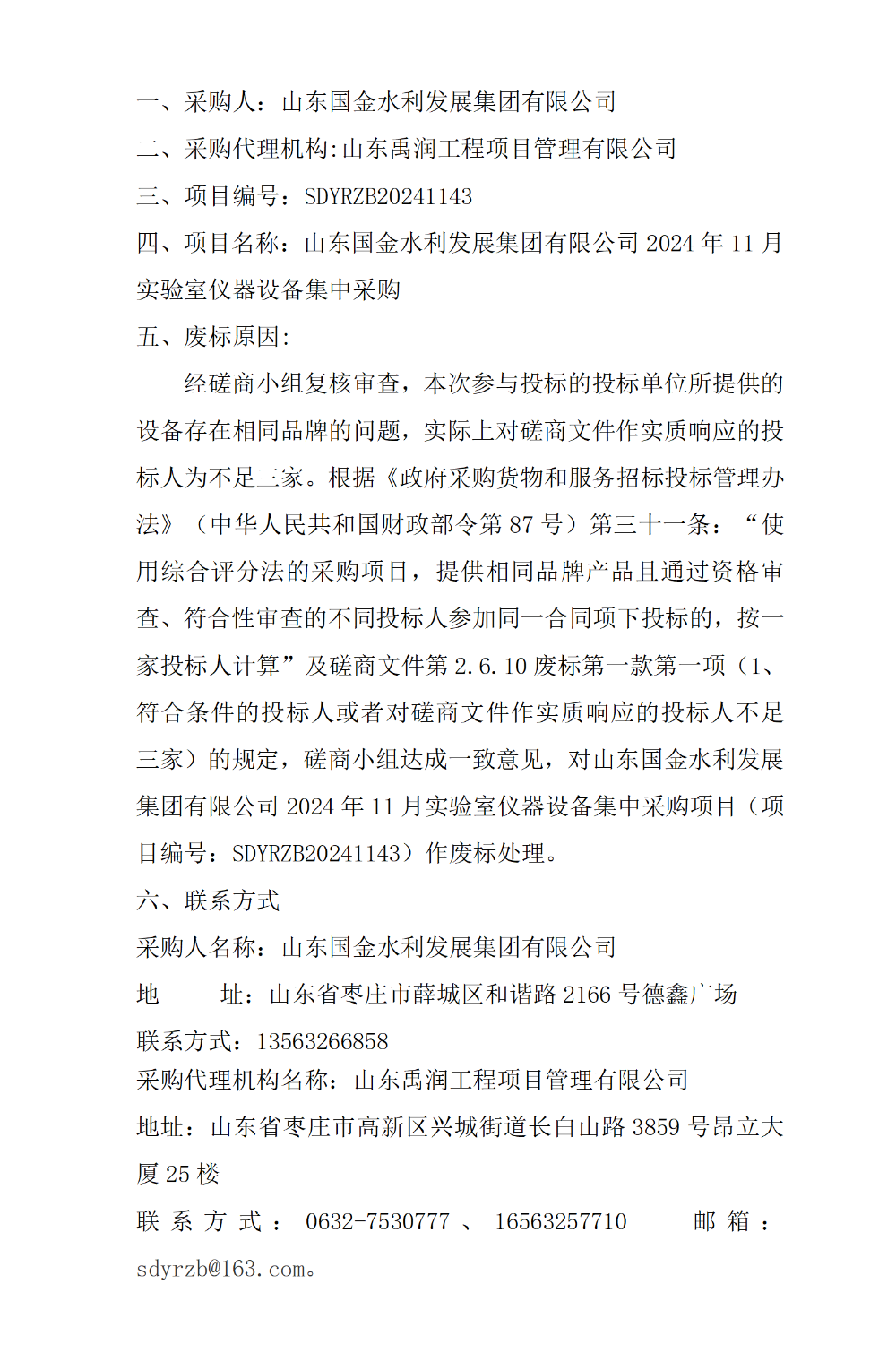 山东国金水利发展集团有限公司2024年11月实验室仪器设备集中采购废标公告