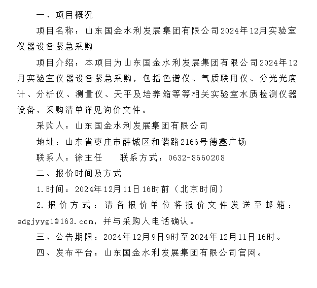 山东国金水利发展集团有限公司2024年12月实验室仪器设备紧急采购
