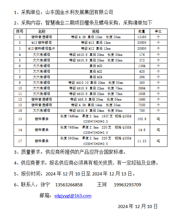 山东国金水利发展集团有限公司智慧渔业二期檀条及螺母采购询价公告