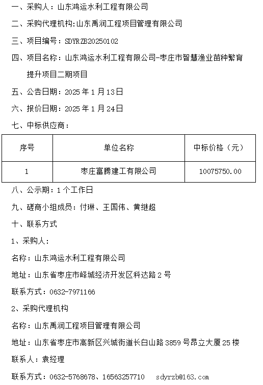 山东鸿运水利工程有限公司-枣庄市智慧渔业苗种繁育提升项目二期项目成交公示
