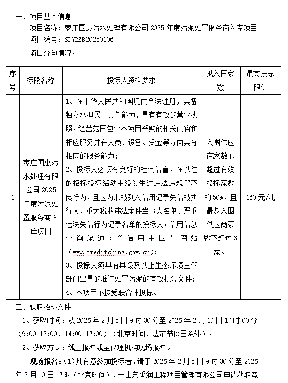 枣庄国惠污水处理有限公司2025年度污泥处置服务商入库项目招标公告