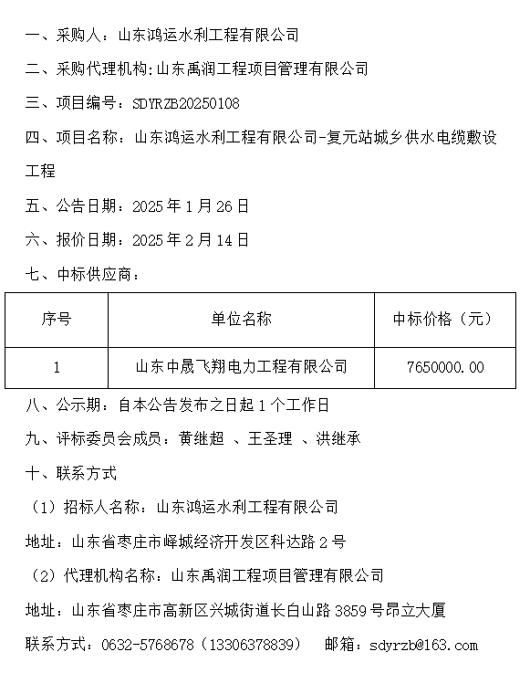 山东鸿运水利工程有限公司-复元站城乡供水电缆敷设工程 中标公示